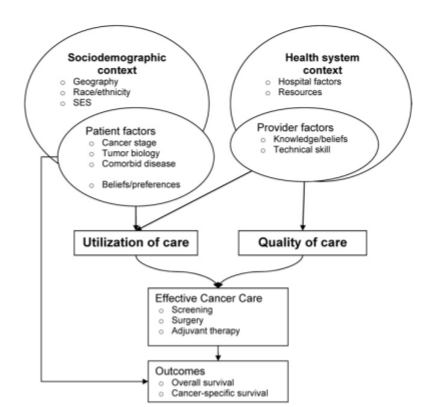 As shown in Figure 1 above, cancer outcomes are influenced by effective cancer care, which in turn is driven by the patient’s utilization of health care, and quality of health care provided by the system and practitioners (Morris et al., 2010).
